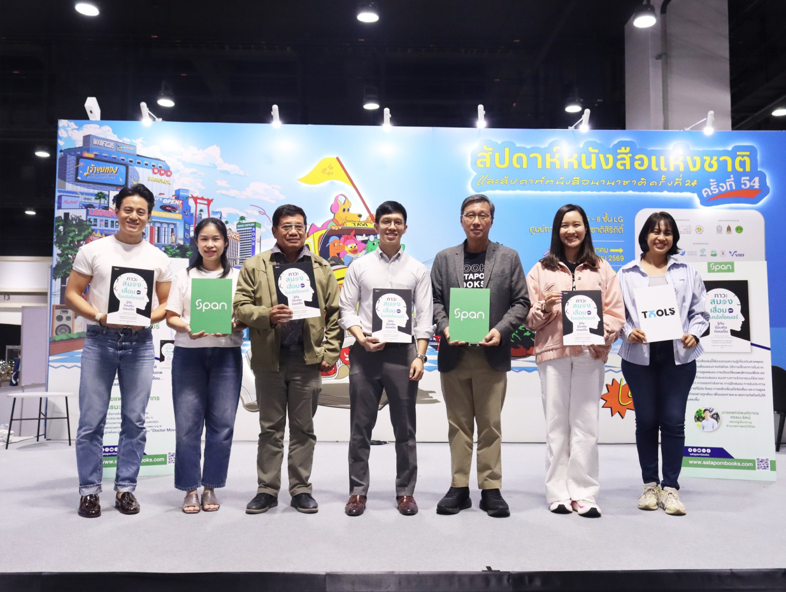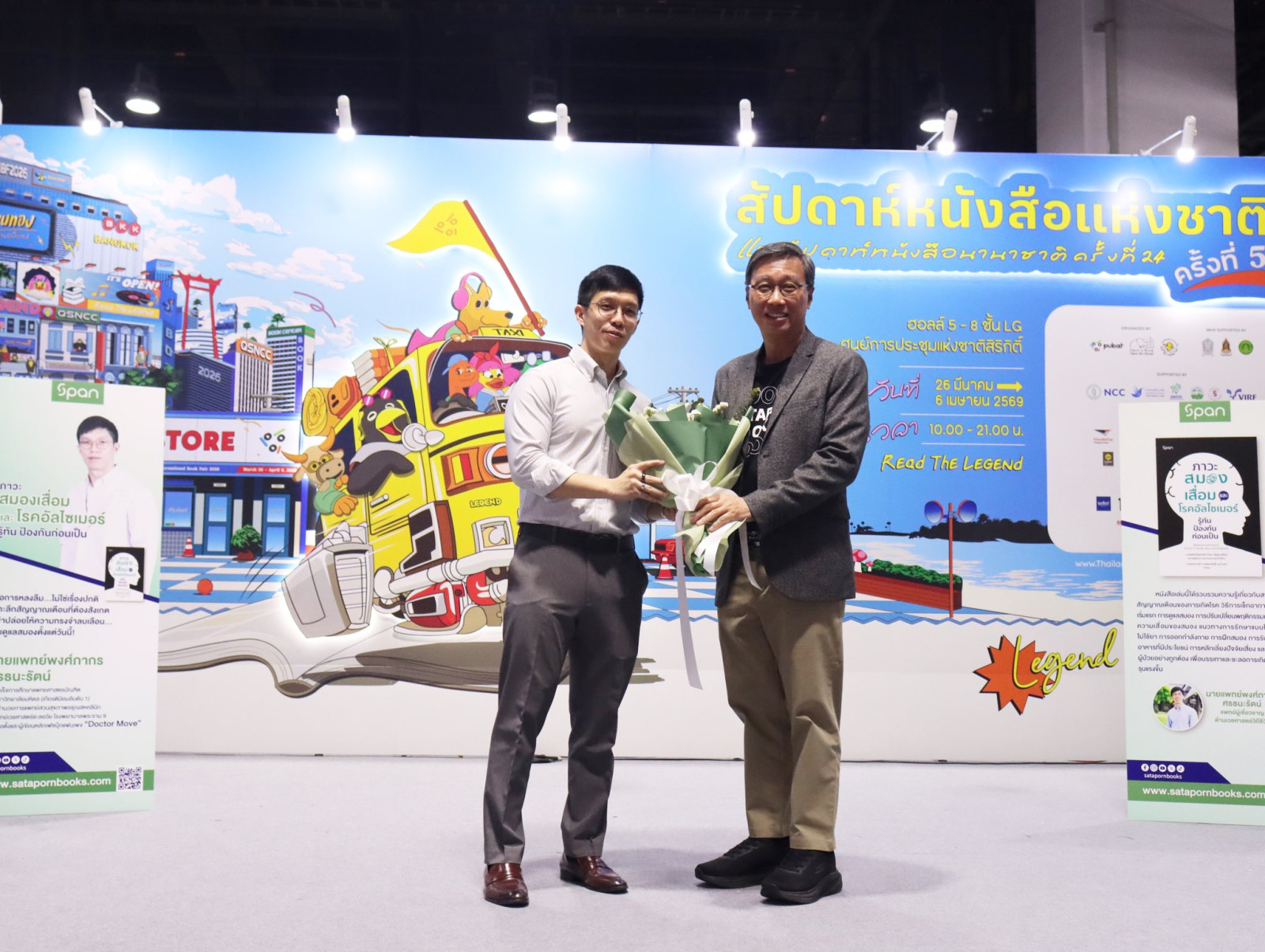 ภาพบรรยากาศการพูดคุยเกี่ยวกับหนังสือเรื่อง ‘ภาวะสมองเสื่อมและโรคอัลไซเมอร์: รู้ทัน ป้องกันก่อนเป็น’ โดยนายแพทย์พงศ์ภากร ศรธนะรัตน์ และคุณวรพันธ์ โลกิตสถาพร ประธานเจ้าหน้าที่บริหาร บริษัทสถาพรบุ๊คส์ จำกัด พร้อมพิธีกร คุณพชรพล ทรัพย์เปี่ยมลาภ ณ เวทีกลาง ในงานสัปดาห์หนังสือแห่งชาติ ครั้งที่ 54 และสัปดาห์หนังสือนานาชาติ ครั้งที่ 24 ที่ศูนย์การประชุมแห่งชาติสิริกิติ์ ซึ่งกิจกรรมนี้ได้รับความสนใจจากผู้เข้าร่วมฟังเป็นอย่างมาก