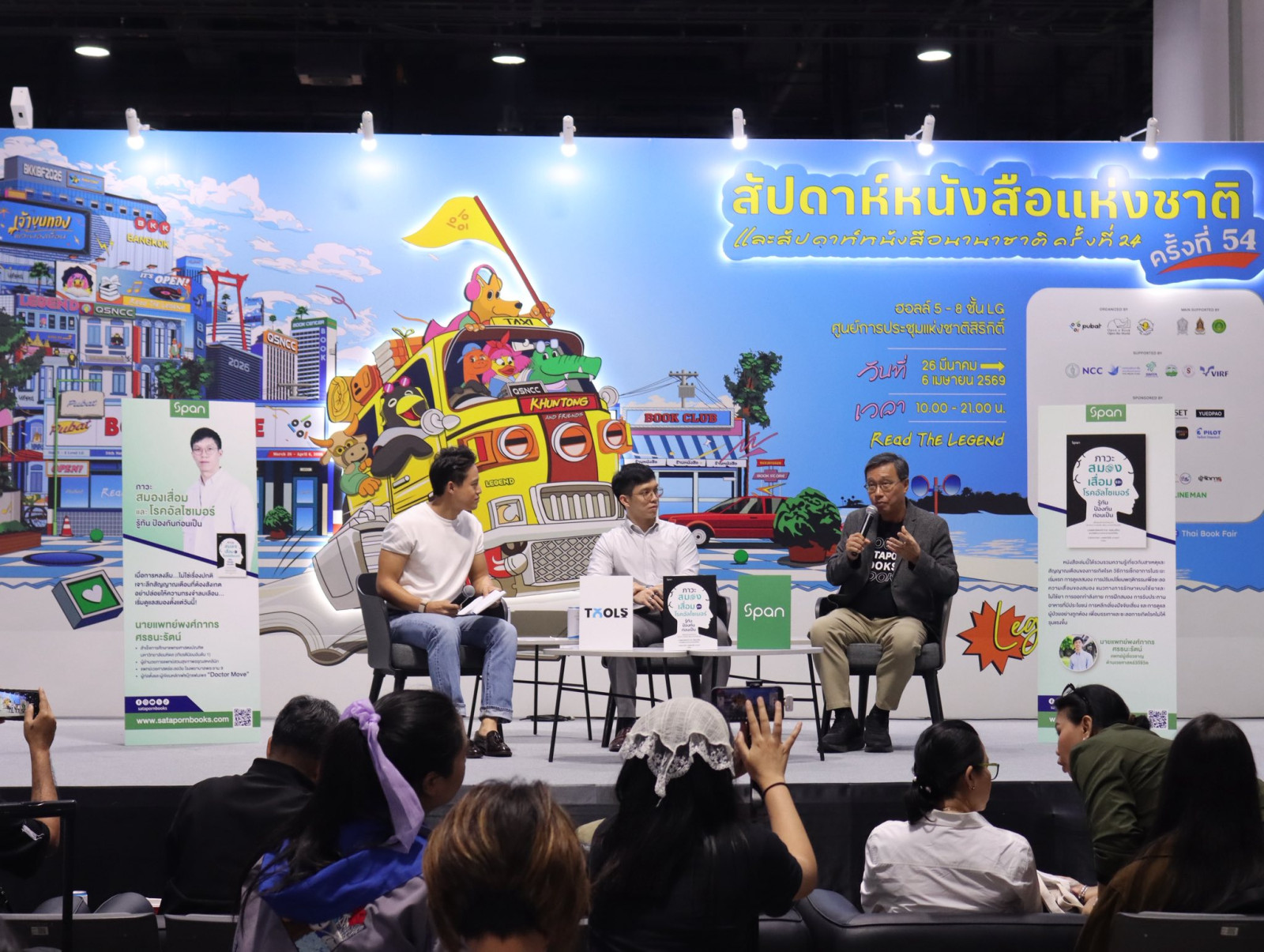 ภาพบรรยากาศการพูดคุยเกี่ยวกับหนังสือเรื่อง ‘ภาวะสมองเสื่อมและโรคอัลไซเมอร์: รู้ทัน ป้องกันก่อนเป็น’ โดยนายแพทย์พงศ์ภากร ศรธนะรัตน์ และคุณวรพันธ์ โลกิตสถาพร ประธานเจ้าหน้าที่บริหาร บริษัทสถาพรบุ๊คส์ จำกัด พร้อมพิธีกร คุณพชรพล ทรัพย์เปี่ยมลาภ ณ เวทีกลาง ในงานสัปดาห์หนังสือแห่งชาติ ครั้งที่ 54 และสัปดาห์หนังสือนานาชาติ ครั้งที่ 24 ที่ศูนย์การประชุมแห่งชาติสิริกิติ์ ซึ่งกิจกรรมนี้ได้รับความสนใจจากผู้เข้าร่วมฟังเป็นอย่างมาก